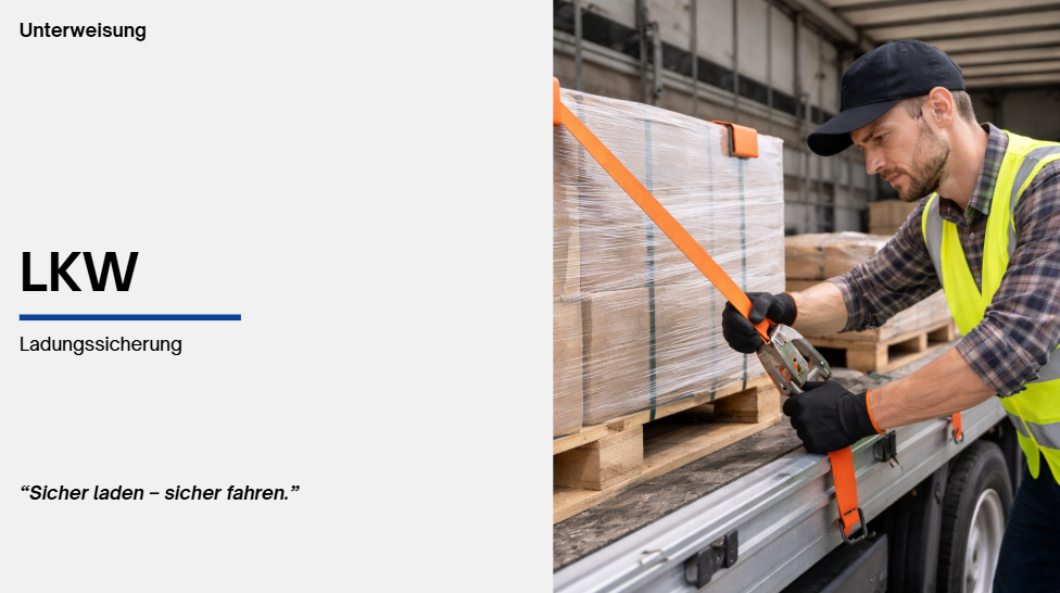 In dieser Unterweisung lernen Fahrerinnen und Fahrer, wie sie ihre Ladung im LKW sicher und vorschriftsgemäß sichern. Behandelt werden die wichtigsten Grundlagen der Ladungssicherung sowie geeignete Maßnahmen und Hilfsmittel. Die Teilnehmenden erfahren, worauf sie beim Verladen, während der Fahrt und bei Kontrollen achten müssen, um Gefahren zu vermeiden und sicher unterwegs zu sein.